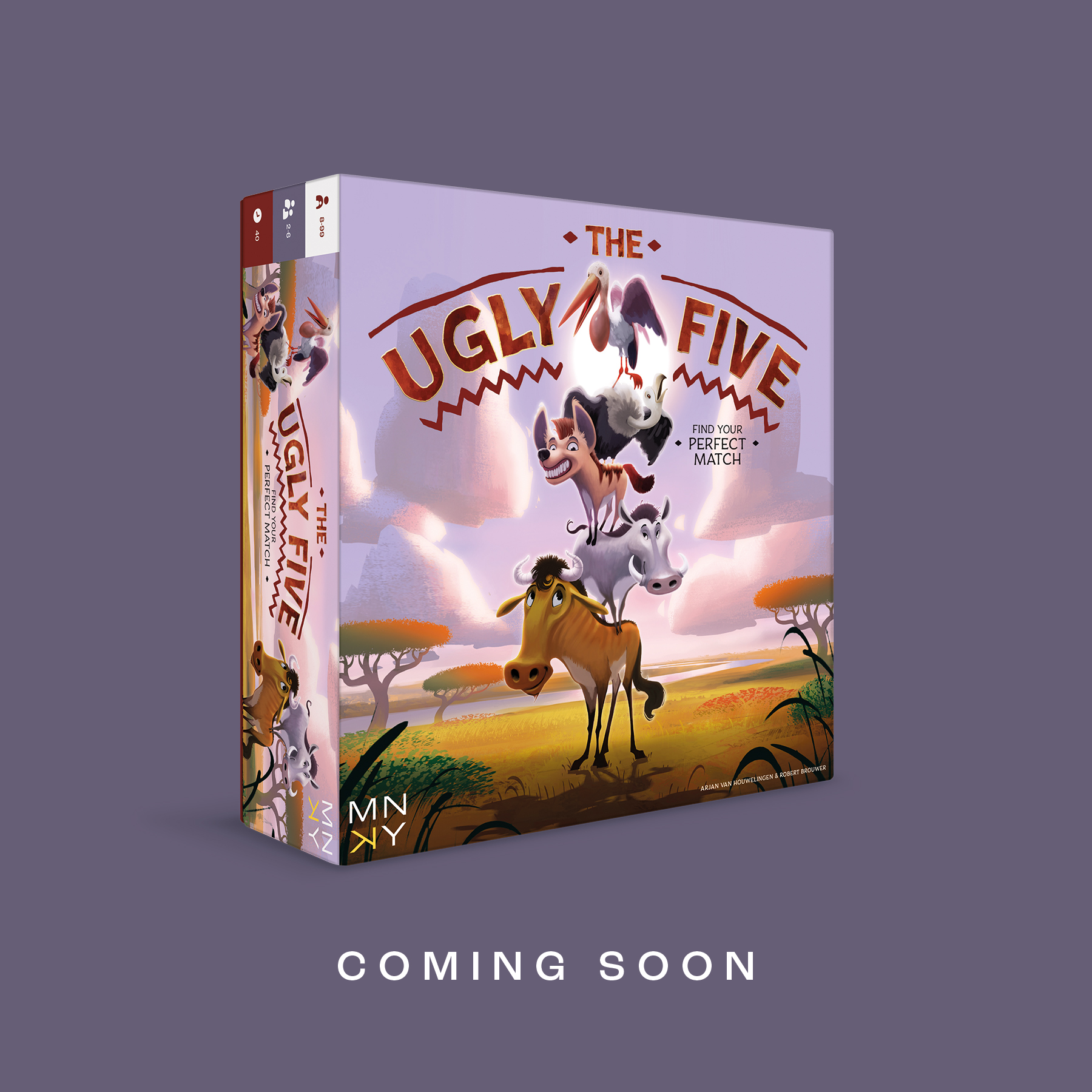 Elke speler heeft in dit spel zijn eigen Ugly Five: een gnoe, een hyena, een maraboe, een gier en een wrattenzwijn. Ze zijn misschien niet gracieus, of heel fotogeniek. Sterker nog, ze zijn misschien ronduit lelijk om naar te kijken. Maar het zijn jóuw Ugly Five, en jij gaat bewijzen dat ze de mooiste wezens op aarde zijn. Help ze op zoek te gaan naar hun innerlijke schoonheid. Begeleid je Ugly Five langs verschillende landschappen, langs bergen en savannes, langs bossen en woestijnen, om ze hun mooie zelf te laten ontdekken. Laat je lieve, lelijke dieren beseffen hoe mooi hun reflectie kan zijn, wat een elegant spiegelbeeld ze hebben. Kortom, zorg ervoor dat jouw Ugly Five hun perfecte match vinden. Maar pas op: je tegenstanders kunnen je lelijk dwarszitten. Speel je het slim, dan ben jij misschien de winnaar in dit meesterlijk maffe spel vol lachwekkende lelijkheid, verborgen schoonheid en beestachtige elegantie…